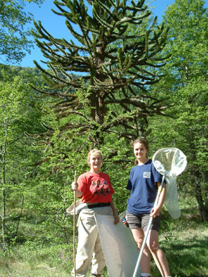 Mary Liz and Shauna with araucaria and beech trees in the background