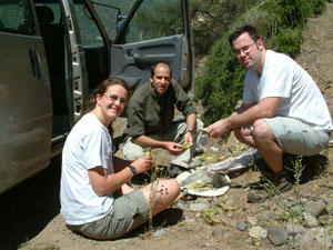 Shauna, Fede, and Matt dissecting cactus flowers for Arctodium specimens. |