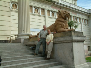 Brett and Mary Liz with saber tooth cat at the main entrance to the
