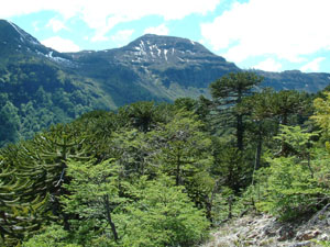 Vista in Parque Nacional Tolhuaca showing araucaria trees and snow-capped