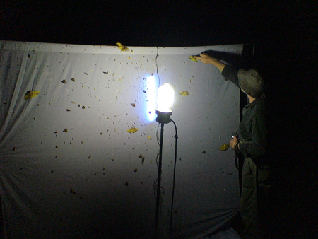 | After leaving Mamanoots, we drove back to Belmopan and then west to Georgeville where we then took a less than nice road south over the Mountain Pine Ridge to the Las Cuevas Research Station in Chiquibul National Park in the Cayo District. The station is remote, and for the last 20 km the road became narrower and narrower. The station is located in good forest and has bunk houses, a classroom, lab, dining area, kitchen, visiting British researchers, and a local contingent of the Belize Defense Force (BDF). We got our light set up (in the rain) and also used the large merc light permanently affixed to the end of the lab building specifically for attracting insects (at least this had a roof over it). Enema endymion swarmed the place! Dung and fruit traps were also set up as well as the flight intercepts. Even with all the sudden, and continuing, rain, the protracted dry season that was just ending slowed the expected emergence of our beetles. |