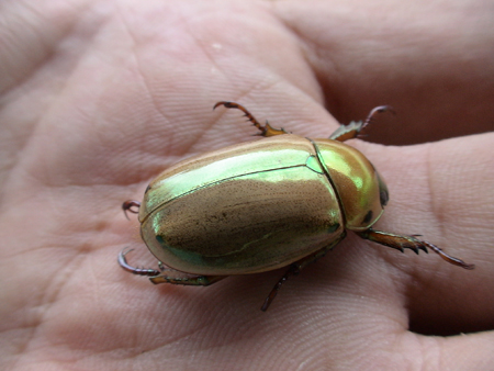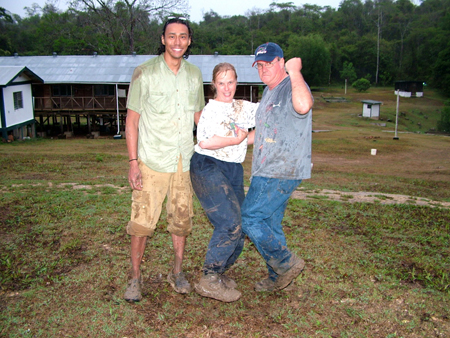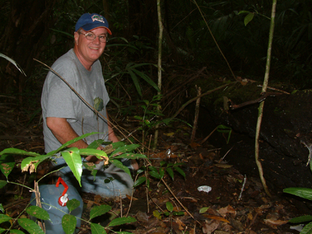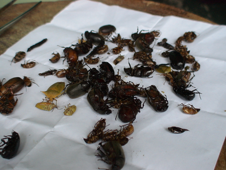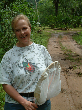 Team Scarab members Brett Ratcliffe, Ron Cave (University of Florida), Mary Liz Jameson, and Jesus Orozco (PhD student in the Team Scarab lab) traveled to Belize for two weeks (27 May to 9 June 2008) to collect and make field observations in multiple localities. This trip was conducted for the NSF-sponsored project entitled "A Biotic Inventory of the Dynastine Scarabs of Mexico, Guatemala, and Belize" with PIs Brett Ratcliffe and Ron Cave. After spending the first night in Belmopan in order to obtain permits, we proceeded to our first base camp at Mamanoots Backabush ecolodge just outside of Mayflower National Park in the Stann Creek District in the southern part of the country. After checking in, we immediately proceeded further south to the Cockscomb Jaguar Reserve to set fruit traps and intercept traps. We arrived back at Mamanoots at dusk to learn that the family dog had barely escaped a puma on the lodge grounds a couple of nights before! While watching for pumas, we set up our lights at Mayflower just down the road in heavy rain . . . not knowing that hurricane Alma from the Pacific was meeting tropical storm Arthur from the Atlantic right over Belize for what Belizean weather officials later termed the "perfect storm". And so it was for the next three days at Mamanoots: heavy rain. Fortunately, at least some scarabs fly in the rain and were attracted to our fruit traps, dung traps, intercept trap, and light traps. On our last day, Mary Liz was stung by a scorpion, and her tongue and palate went numb, causing us some concern.