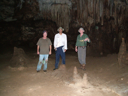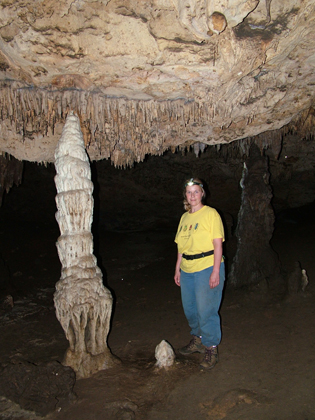 Mary Liz with stalagmites (adult and baby) at Las Cuevas cave.