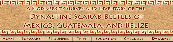 Team Scarab members Brett Ratcliffe, Ronald Cave, M.J. Paulsen, and Jesus Orozco (PhD student in the Team Scarab lab) traveled to Guatemala for two weeks (28 June to 11 July 2009) to collect and make field observations in multiple localities. This trip was conducted as part of our NSF-sponsored project entitled "A Biotic Inventory of the Dynastine Scarabs of Mexico, Guatemala, and Belize" with PIs Brett Ratcliffe and Ron Cave. Our first day was spent planning field logistics and identifying and databasing the dynastine collections at the Universidad del Valle with our in-country collaborator, Enio Cano, the curator of the collections. Ron Cave gave a Powerpoint presentation about the project to university staff and students and the visiting NSF-sponsored LLAMA (Leaf Litter Arthropods of Mesoamerica) team (Robert Anderson, John Longino et al.) from Canada and the U.S.