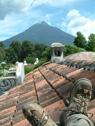 Rooftops of Guatemala Antigua with Volcan d'Agua nearby, July 2009. Photo ex