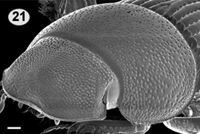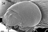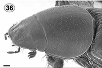 - Body and head flattened (Figs. 39, 62, 66–68); elytra with apical umbone (Figs. 44–45) ...................................................................................................... 28