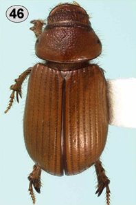 - Body robust, reddish-brown (Fig. 46); metatibia with apical spurs separated by tarsus
