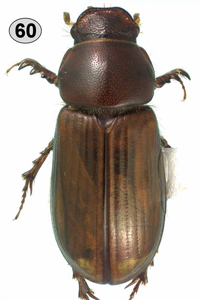 Fig. 36. Aphodius pseudolividus head to elytral base; Fig. 39. Podotenus                (Pseudopodotenus) fulviventris head to elytral base. Fig. 58. Orodaliscoides reflexus male habitus;