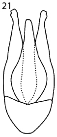 H. argentinensis. 21, ventral view of male genitalia, H. martinezi. 23, outline of anterior portion of pronotum of H. argentinensis, showing lack of produced
