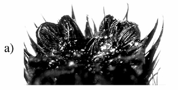FIGURES 6a–b. Dorsal view of labrum and mandibles showing form of the mandibles