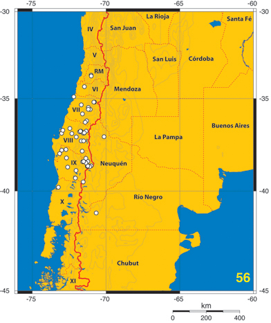 Distribution (Fig. 56): ARGENTINA (2). Neuquén (1): Lago Tromén (1). Río Negro (1): Pilcaniyeu (1). CHILE (341). Región Metropolitana de Santiago (3): El Monte (1); Naltagua (2).VI Región del General Bernardo O’Higgins (1): Alto Huemul, San Fernando (1). VII Región del Maule (84): Curicó Maritimo (1); El Coigo (1); Fundo El Radal (2); Fundo Malcho (5); La Balsa (4); La Mina (17); Laguna del Maule (2); Lara Bullileo (4); Linares (7); Parque Inglés (2); Parral (1); Potrero Grande (2); Reserva Nacional Radal 7 Tazas (3); Vilches Alto (33). VIII Región del Biobío (190): Abanico (2); Antuco (1); Atacalco (12); Chiguayante (50); Coihueco (1); Cordillera de Chillán (8); Fundo El Castillo (1); Fundo El Roble (1); La Invernada (10); Las Trancas (54); Los Angeles (5); Los Lleuques (10); Nonquén (1); Piedras Comadres (10); Puente Marchant (8); Puente Torrealba (1); Ralco (1); Recinto (4); Río Ñuble (1); Shangri-la (7); Yungai (1); region record only (1). IX Región de La Araucanía (59): Angol (7); Cunco (1); Laguna Galletue (3); Liucura (1); Lonquimay (15); Malalcahuello (1); Marimenuco (7); Molco (1); Nahuelbuta (2); Parque Nacional Nahuelbuta, Pehuenco (1); Parque Nacional Villarrica, Puesco (5); Temuco (3); Traiguen (1); Villa Portales (10); Volcán Lonquimay (1). XIV Región de Los Ríos (1): Valdivia (1). Country record only (3).  |